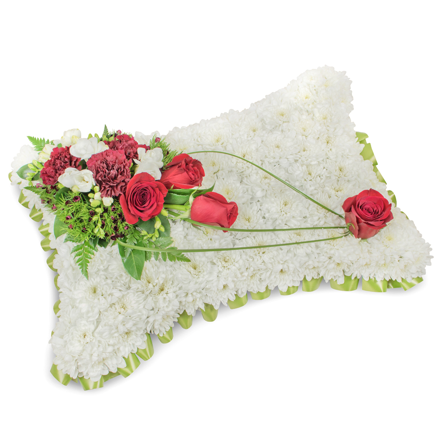 Show your condolences with our luxurious sympathy bouquet, expertly arranged to express your sincere feelings. This distinctive arrangement features a vibrant mix of white chrysanthemums, classic red roses, aromatic white freesias, deep dark red carnations, charming dianthus, and graceful bear grass, offering a stunning display of color and elegance.